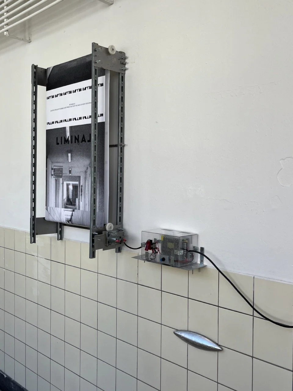 The billboard displays a message. It's an advertisement for liminality. It reads: "Waiting is the new smoking" and "Be passive" "Leave no trace of yourself apart from the dust you kick up with your dragging feet". The frame is also my design- I took inspiration from the rotating billboards you often find at bus stops. I wanted to highlight the mechanical aspect, and built the frame to show off the gears, motor and battery, and so that you'd hear it turning.